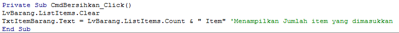 - ketikkan perintah berikut pada Tombol bersihkan yang berfungsi untuk membersihkan seluruh data pada listview